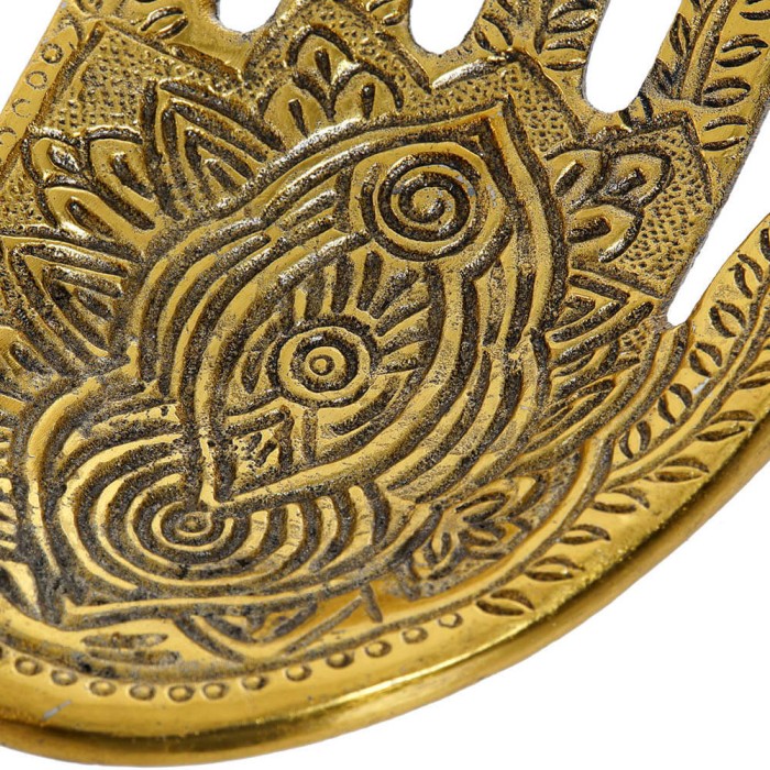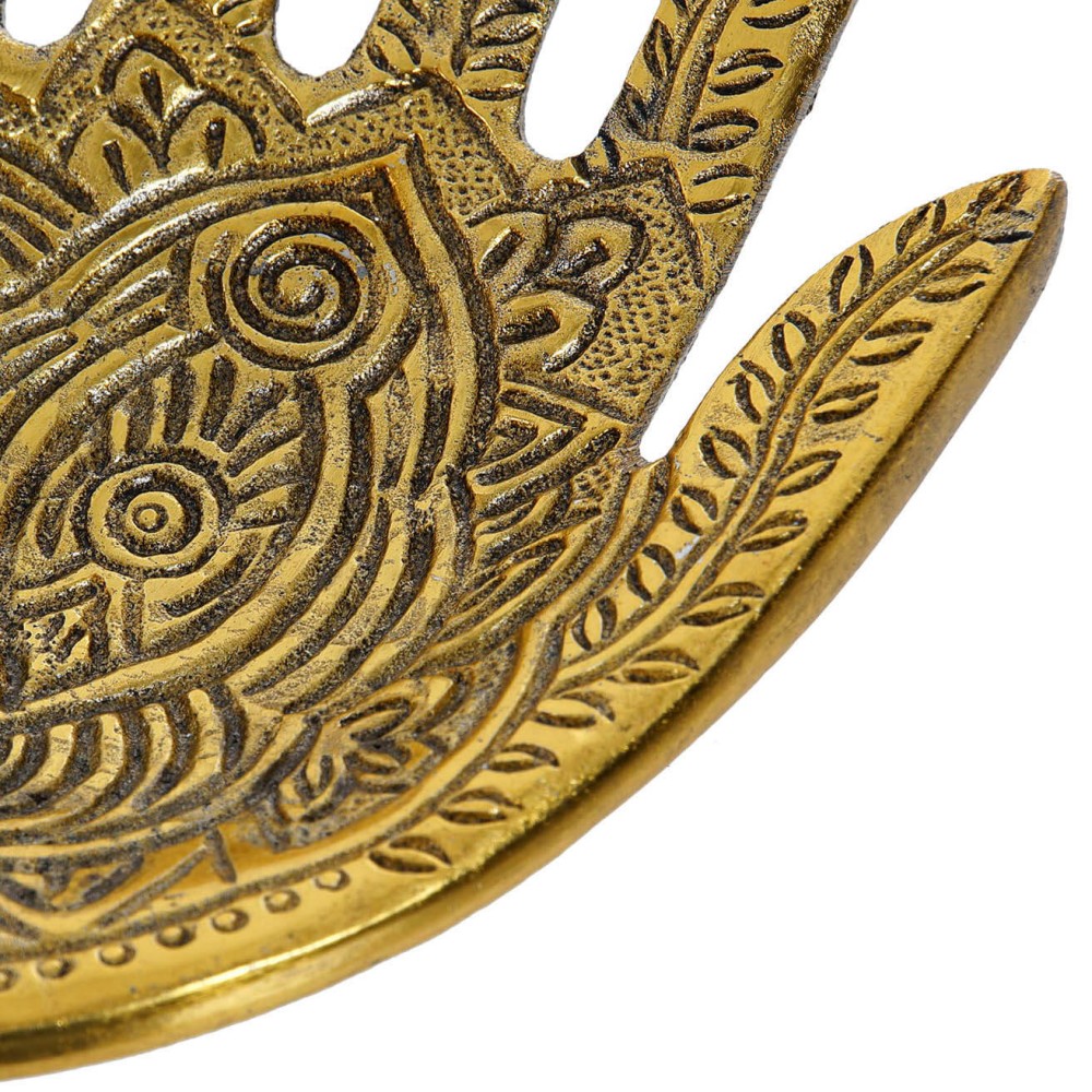 Soporte para incienso en forma de mano realizado en aluminio de color dorado con relieves. Diseño de estilo étnico.