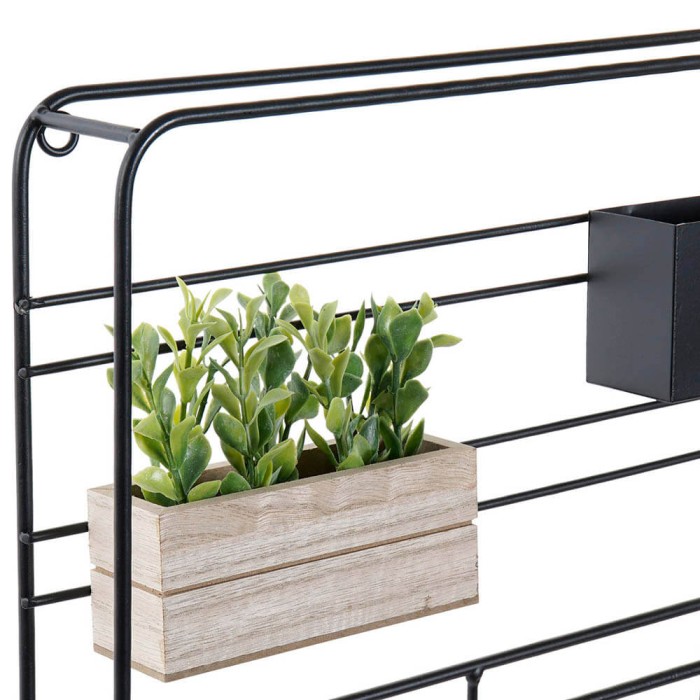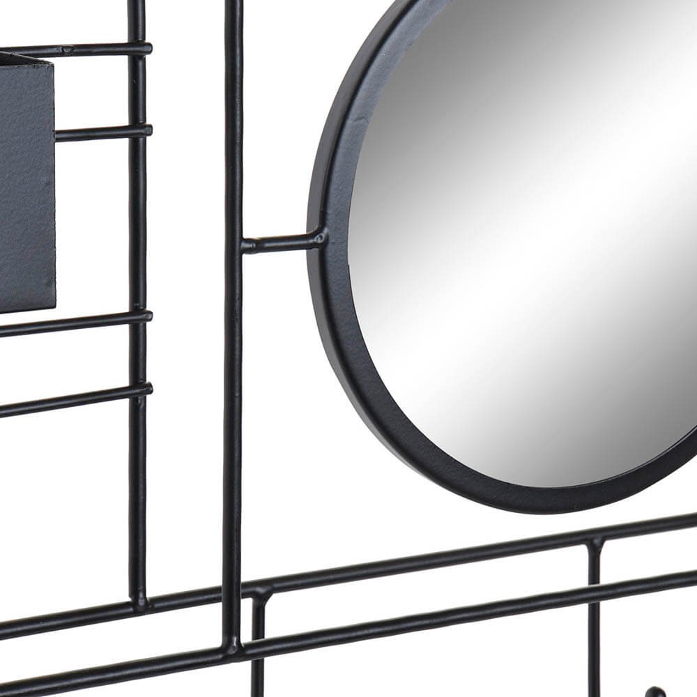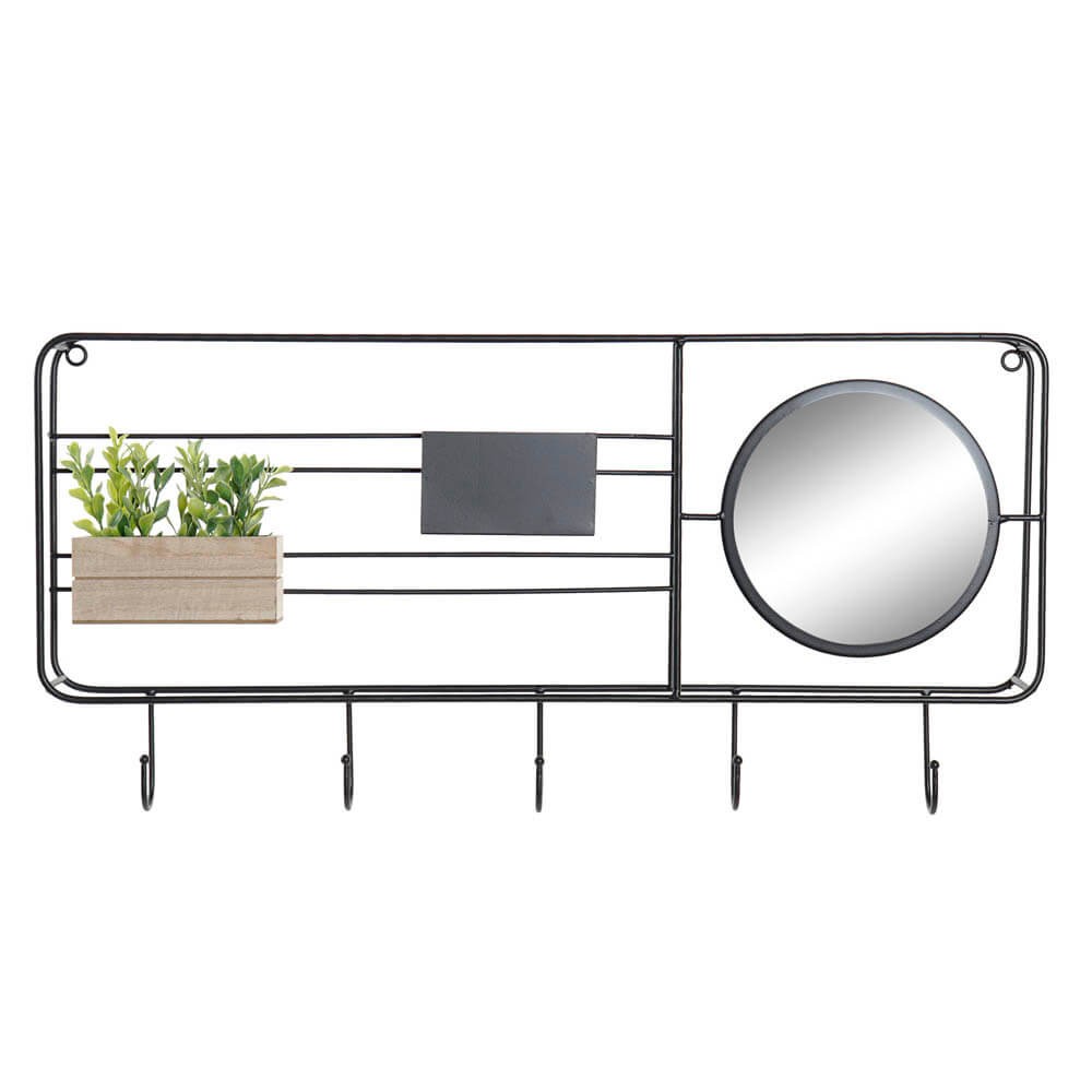 Perchero de pared realizado en metal negro con 5 colgadores, 2 contenedores y espejo. Es una pieza funcional y decorativa, super práctica como perchero recibidor para colgar los abrigos, sombreros y bolsos al llegar a casa, ahora con un diseño moderno y ligero de estilo escandinavo.