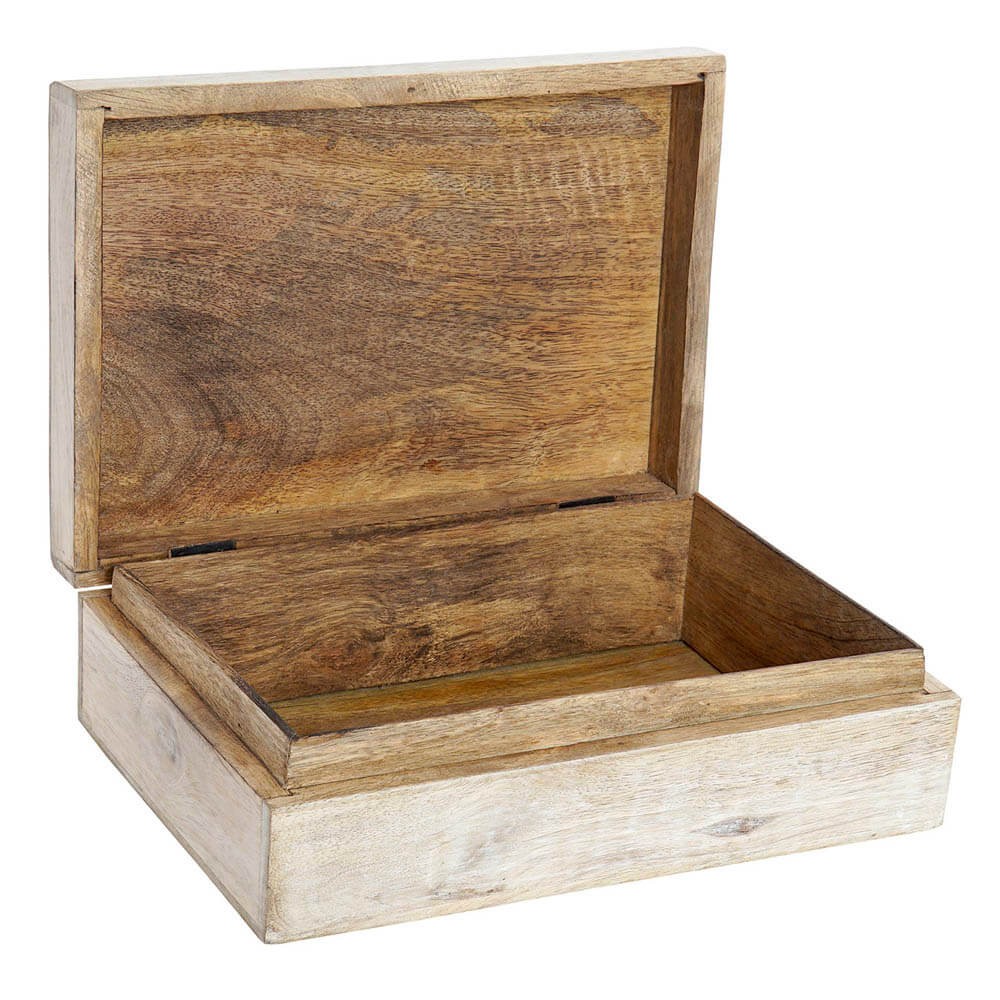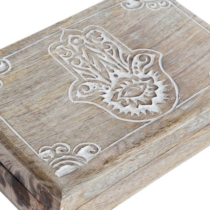 Caja de madera con tapa realizada en madera de mango de color claro con acabado decape y la tapa labrada con la mano de Fatima. La caja de madera decorada es muy útil para guardar objetos de pequeño tamaño, es un accesorio funcional y decorativo, una caja de madera ideal para el salón, recibidor o dormitorio, se puede usar para guardar joyas, bombones, tarjetas, etc.