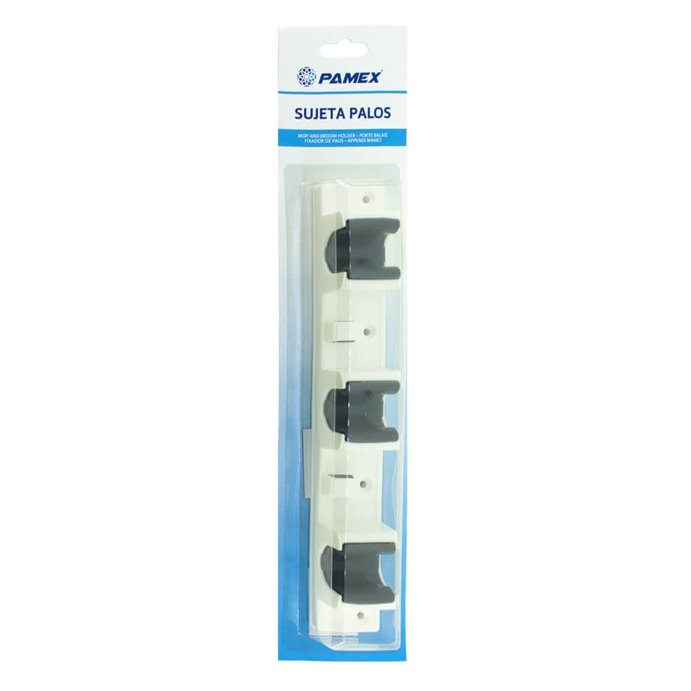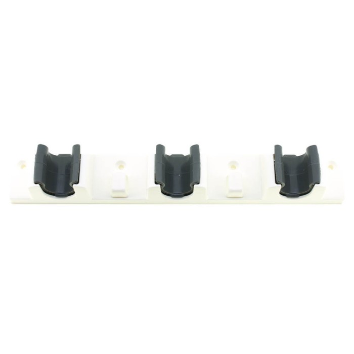 Colgador de escobas realizado en plástico resistente con 3 ganchos para sujetar los palos de las escobas y fregonas, muy práctico para mantener el orden en el hogar.