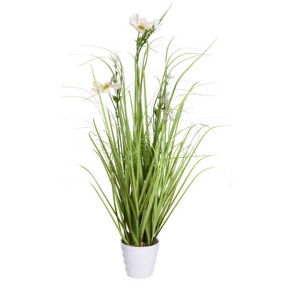 Planta artificial de estilo silvestre en maceta blanca, lleva flores y hierbas realizadas en polipropileno resistente, perfecta para decorar pequeños espacios dando un toque de color y frescura, ideal para hogares y oficinas.
