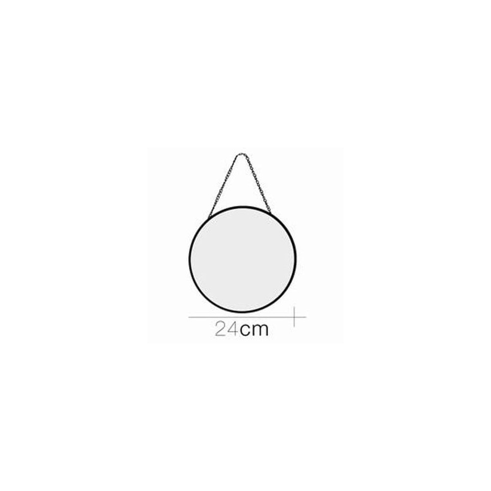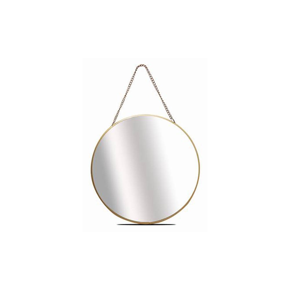 Espejo redondo con cadena para colgar, fabricado en metal dorado.