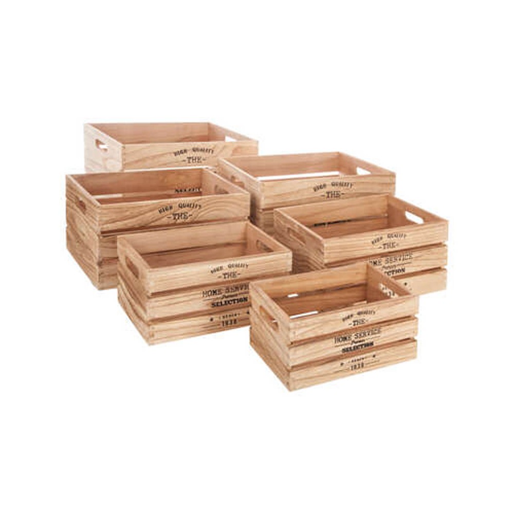 Caja de madera formada por listones de color natural con el frontal decorado con texto negro. La típica caja de fruta con un diseño renovado, un elemento de decoración en tendencia para decorar y ordenar salones, dormitorios y demás estancias del hogar, también se puede emplear como cesta de regalo o como caja de almacenaje para organizar armarios y estanterías. Las hendiduras en forma de asa permiten un agarre cómodo y seguro para transportar el contenido de la caja.