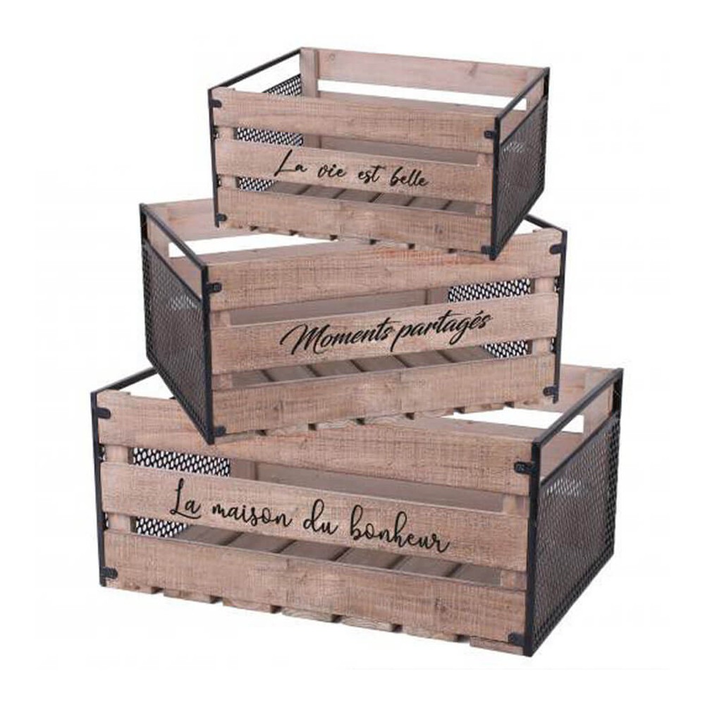Caja de madera decorada con frase compuesta por listones de color natural y costados metálicos pintados de negro, perfecta para guardar todo tipo de objetos.