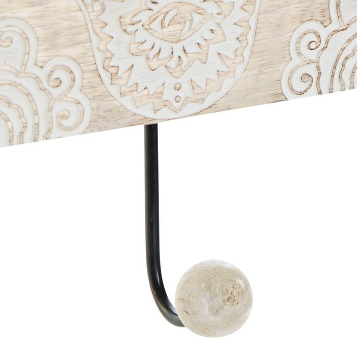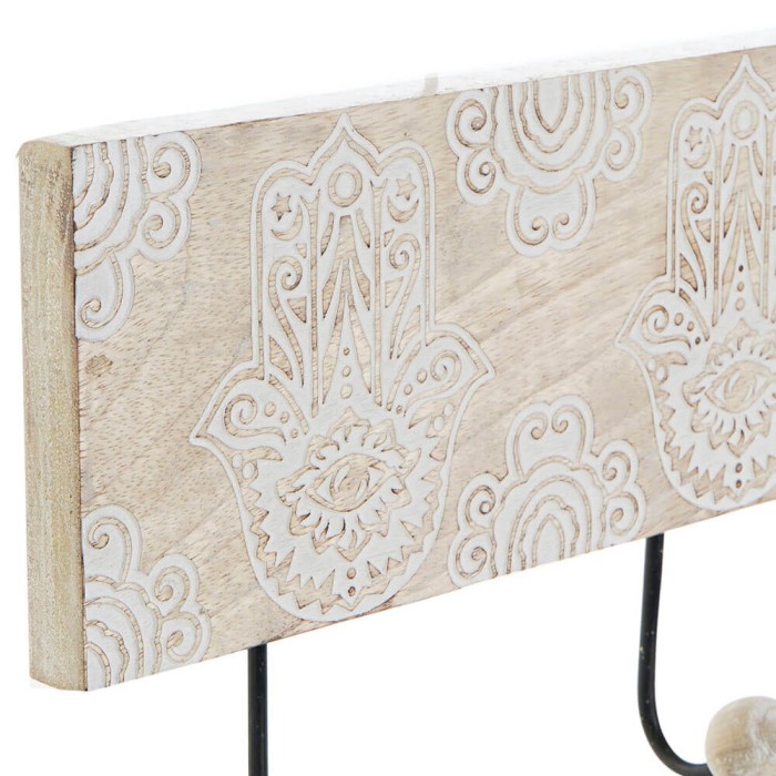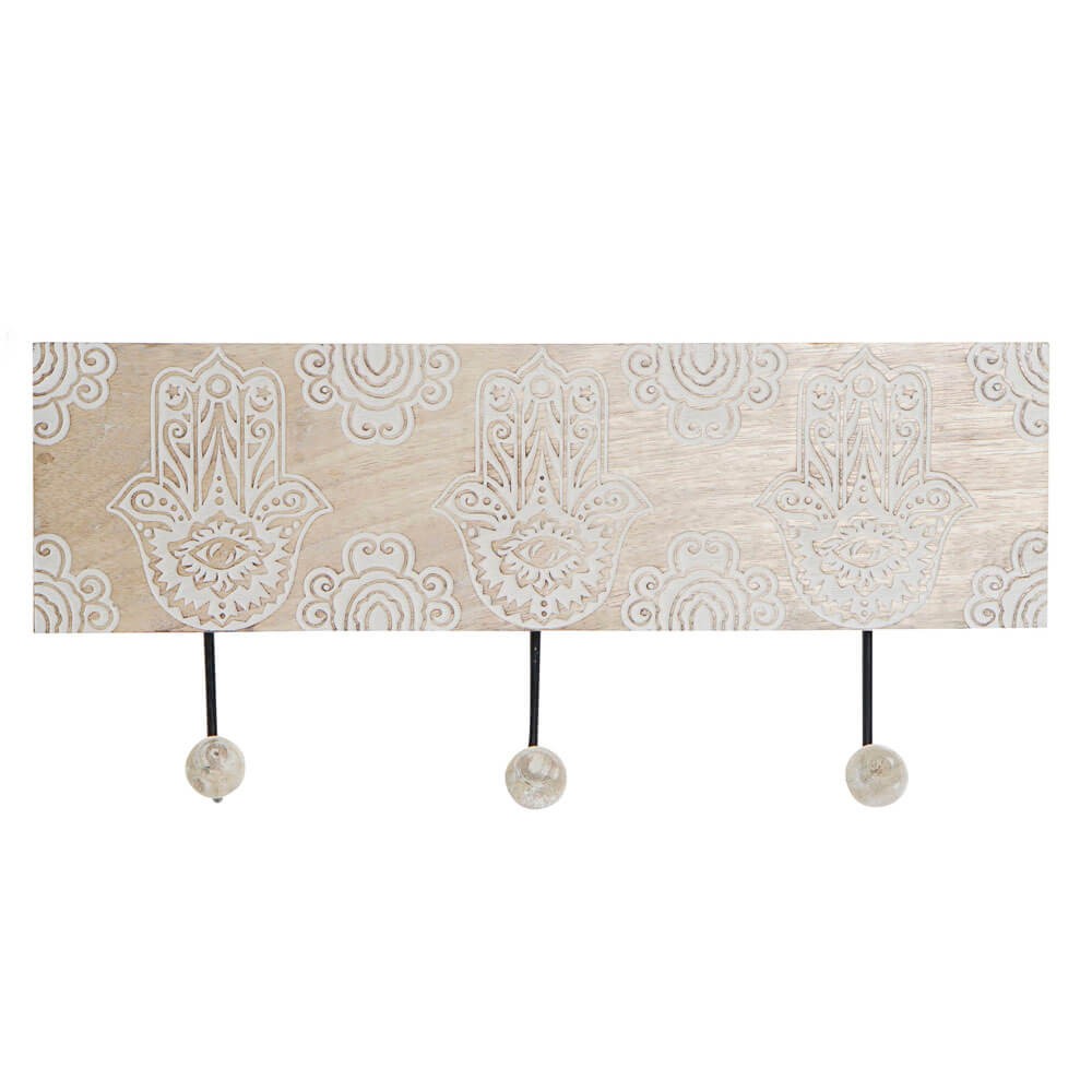 Perchero de pared diseño Hamsa compuesto por un tablero de madera de mango con la superficie tallada y tres colgadores metálicos con terminación de bola de madera, perfecto para colgar prendas de abrigo.