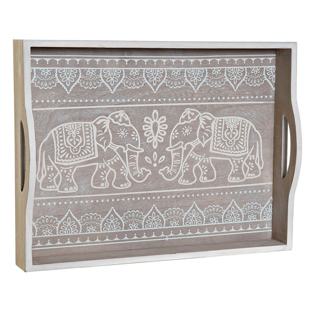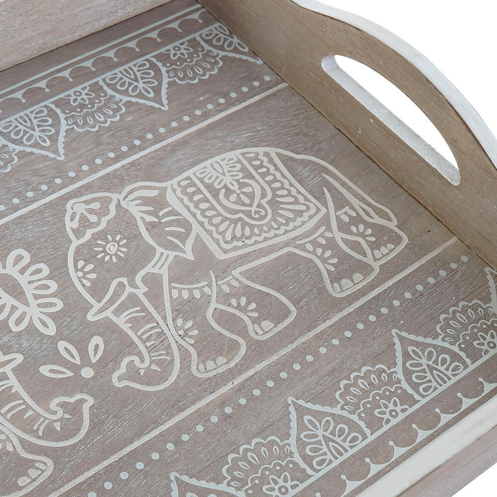 Bandeja decorativa fabricada en madera MDF con los laterales elevados para impedir que se caiga el contenido, lleva dos asas para agarrarla cómodamente y la superficie tallada con elefantes y elementos de estilo Indio.