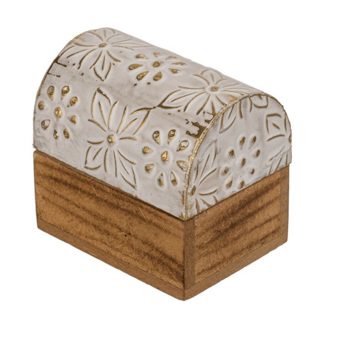 Caja de madera pequeña tipo cofre con la tapa cubierta de metal chapado en color blanco con reflejos dorados, 6 diseños diferentes de estilo oriental según disponibilidad.