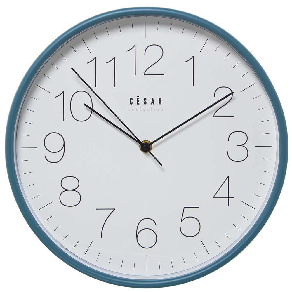 Reloj de pared con movimiento de las agujas continuo, diseño redondo de 30 cm de diámetro con carcasa acrílica azul, manecillas negras y esfera blanca con números naturales en negro para una lectura fácil incluso a larga distancia.