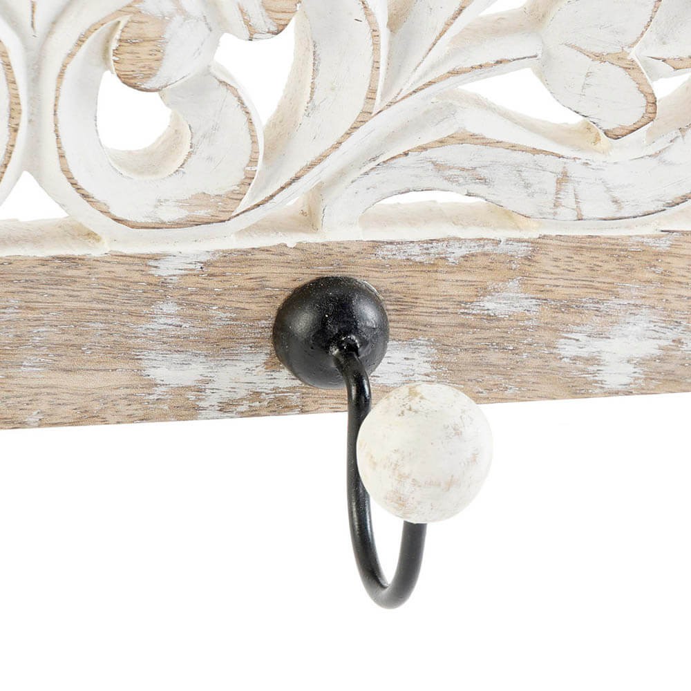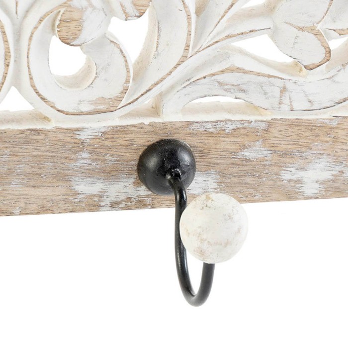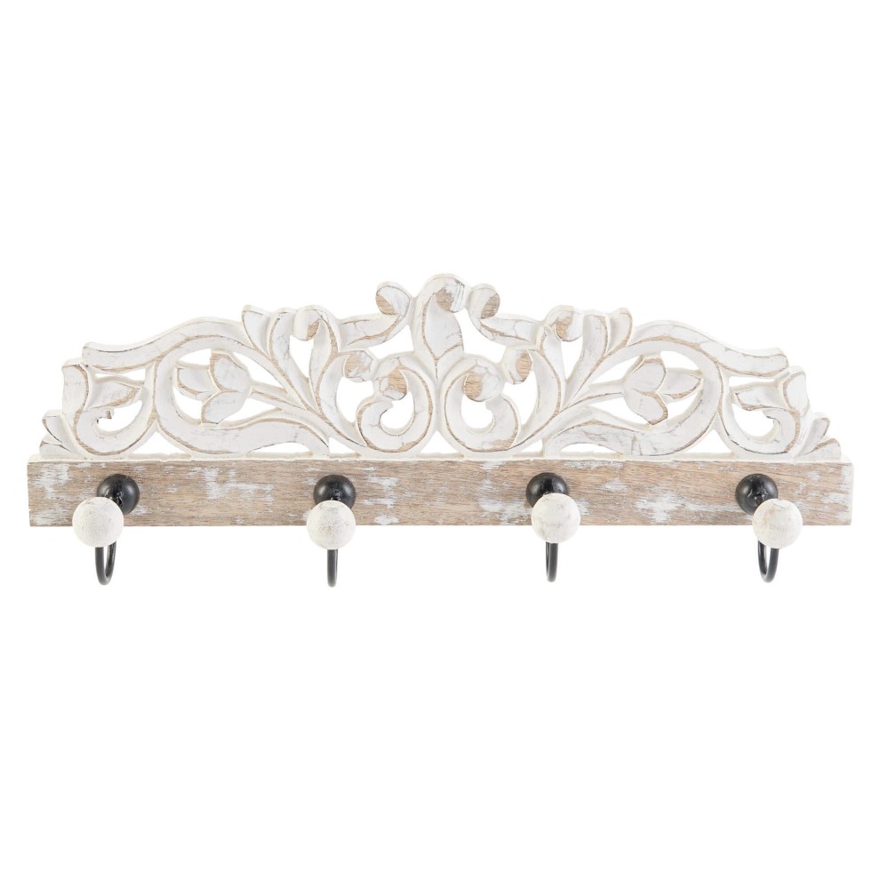 Perchero de pared en madera de mango tallada con patina blanca efecto envejecido, lleva 4 ganchos metálicos acabados con bola para colgar prendas de abrigo.