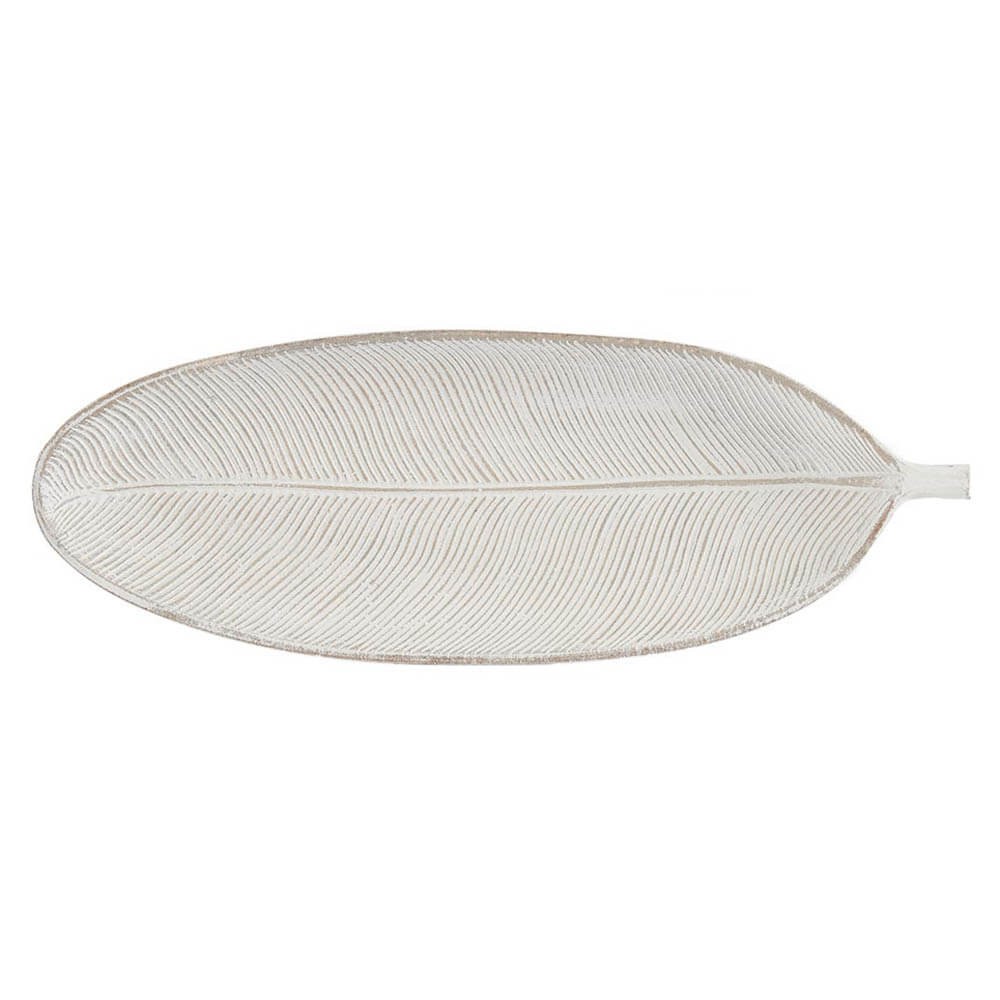 Centro de mesa en forma de hoja alargada realizado en madera MDF de color gris con la superficie blanqueada, un complemento perfecto para embellecer y dar un toque personal a los muebles del hogar.