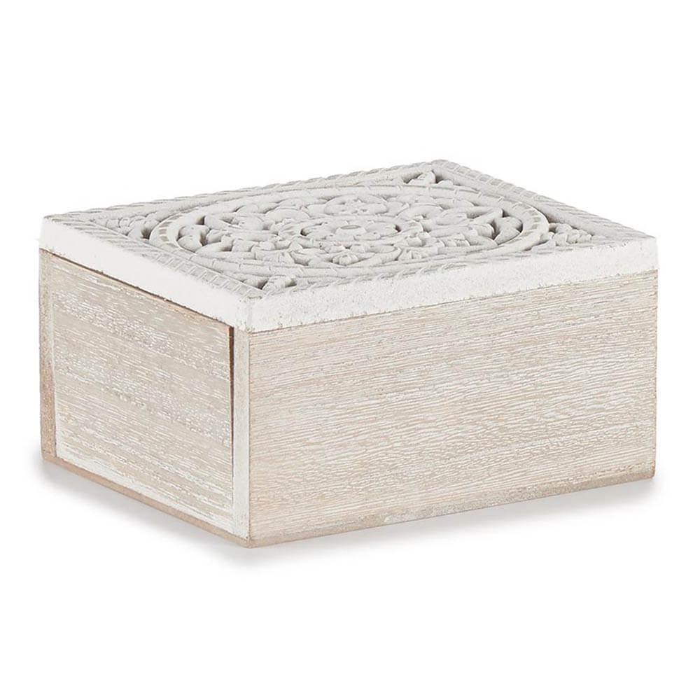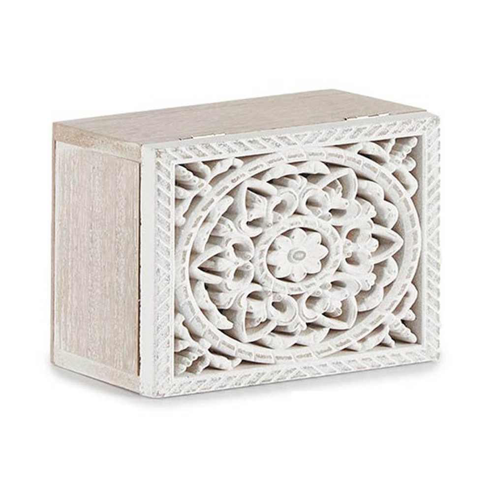 Caja de madera MDF acabado blanco rozado en formato rectangular con tapa abatible calada decorada con un mándala floral tallado, perfecta como complemento de decoración para el salón, recibidor o dormitorio.