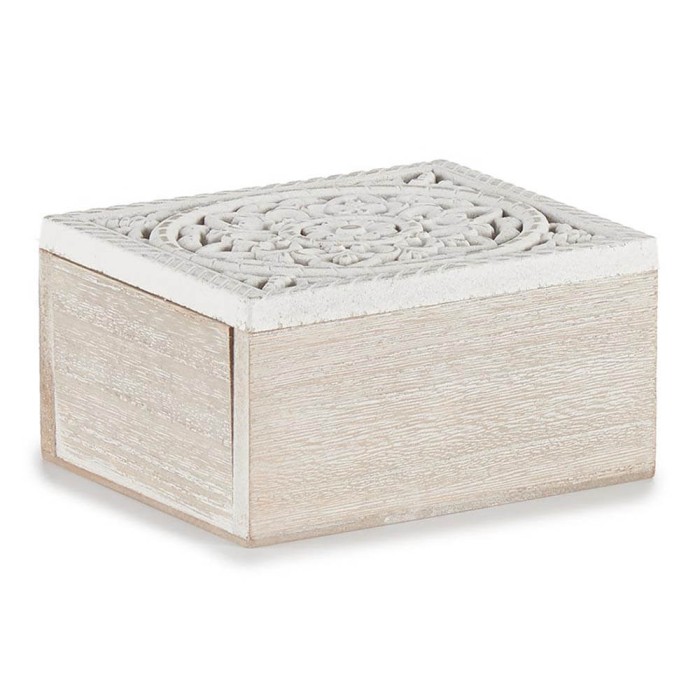 Caja decorativa de madera acabado blanco rozado con tapa abatible decorada con un mándala calado de estilo indio.