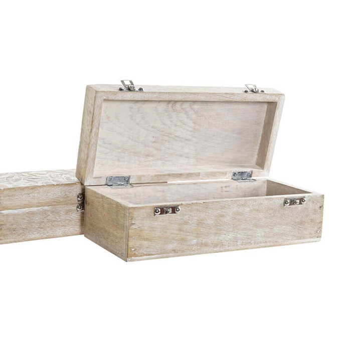 Caja de madera con tapa tallada y cierre metálico, ideal como complemento de decoración para salones y dormitorios.