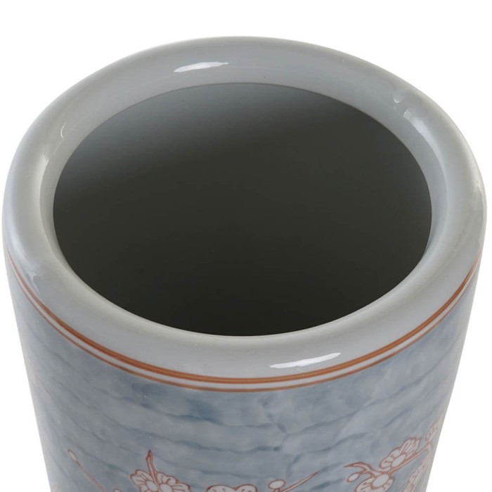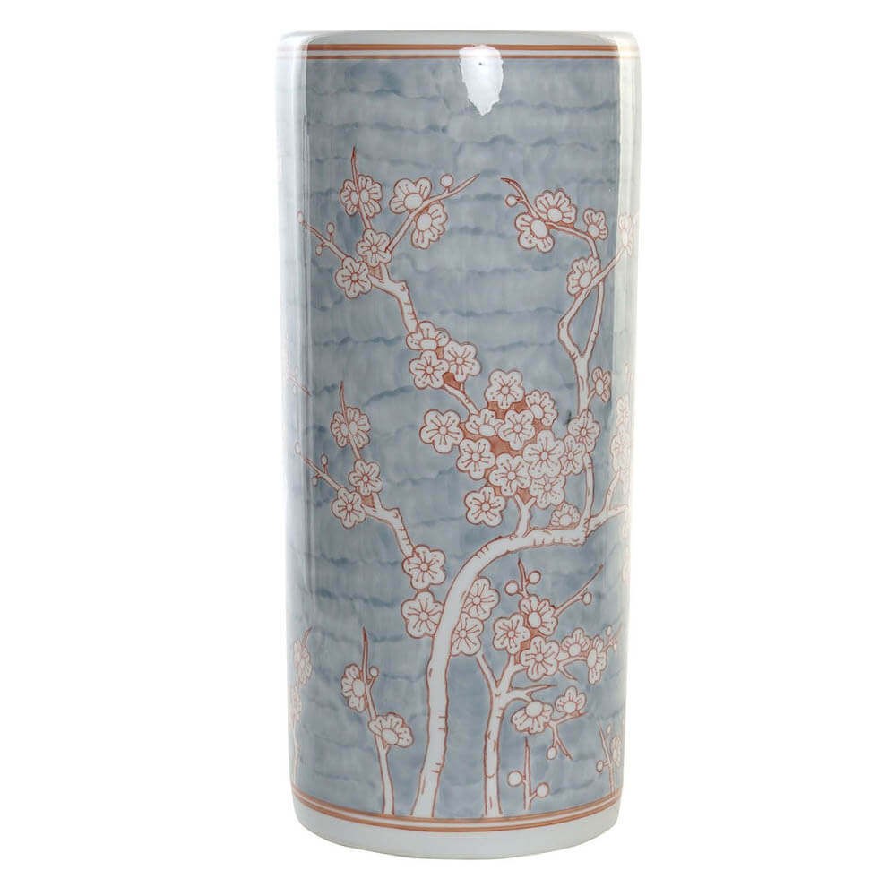 Paragüero cilíndrico fabricado en porcelana con un maravilloso decorado de estilo oriental en color azul con ramas y flores de almendro anaranjadas, perfecto para colocar en la entrada o recibidor de una casa, comercio u oficina.