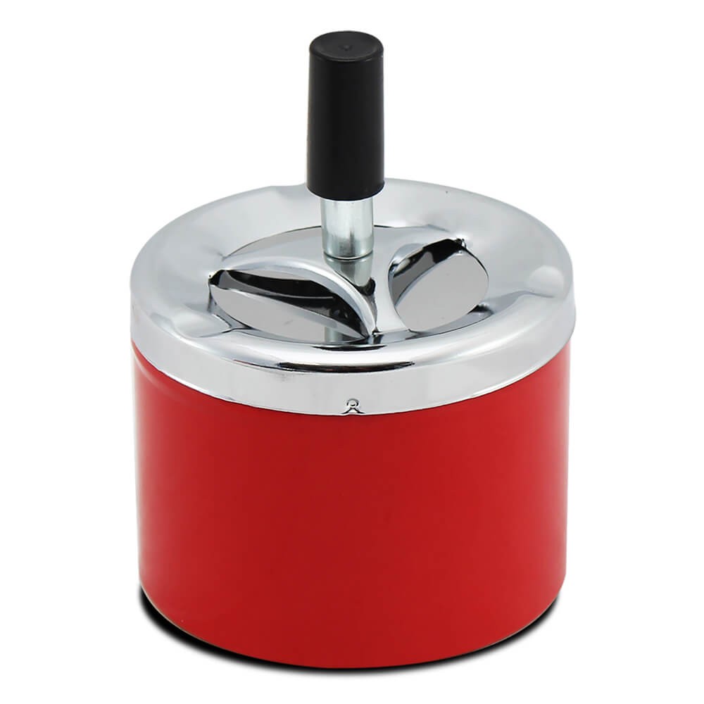 Cenicero de lata en rojo o negro con botón pulsador para dejar caer la ceniza al contenedor. Diámetro: 9 cm. Altura: 12 cm.