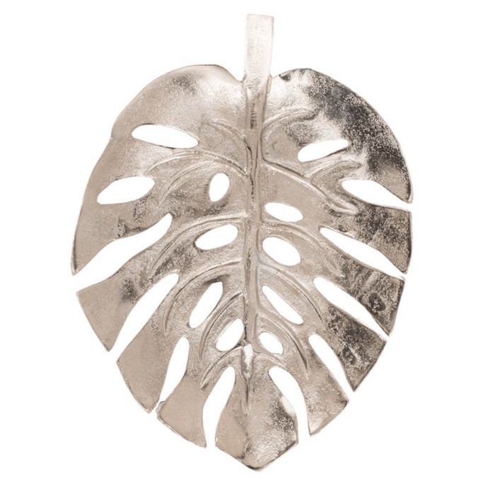 Bandeja decorativa realizada en metal de color plata con forma de hoja de Monstera, un complemento de decoración ideal como centro de mesa.