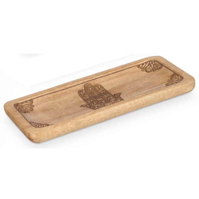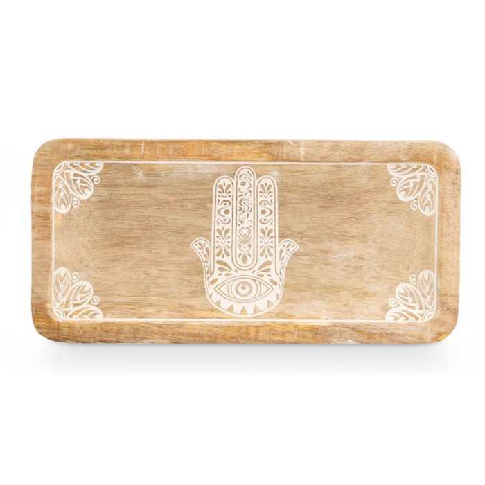 Bandeja de madera de mango diseño Hamsa, ideal como bandeja decorativa o vacía bolsillos para depositar las monedas, llaves y cartera al llegar a casa. 3,5 x 31 x 15 cm.