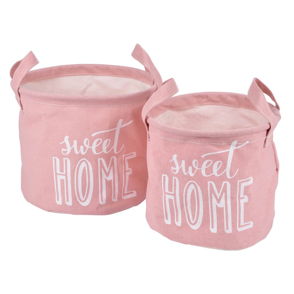 Cesta de ordenación con asas en formato redondo, realizada en tela de poliéster de color rosa estampada con la inscripción Sweet home en blanco, lleva el interior plastificado, perfecta como cesta de baño para contener y organizar peines, pintalabios, cremas y demás objetos. Esta cesta con asas es muy útil para organizar cajones y armarios.