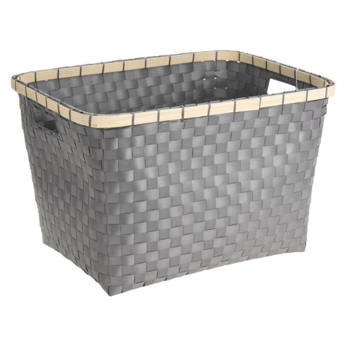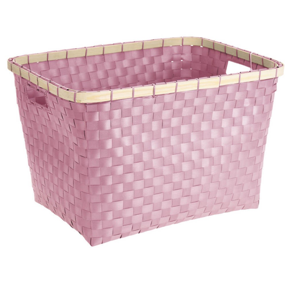 Organiza los armarios y estanterías con estilo gracias a esta cesta de almacenaje rectangular, con ella podrás ordenar juguetes, libros, revistas, ropa de bebe, pañales, bufandas, cinturones, etc. Una cesta formada por cintas trenzadas de polipropileno en color rosa o gris rematada con una tira de bambú en la parte superior, muy cómoda de transportar gracias a sus asas.