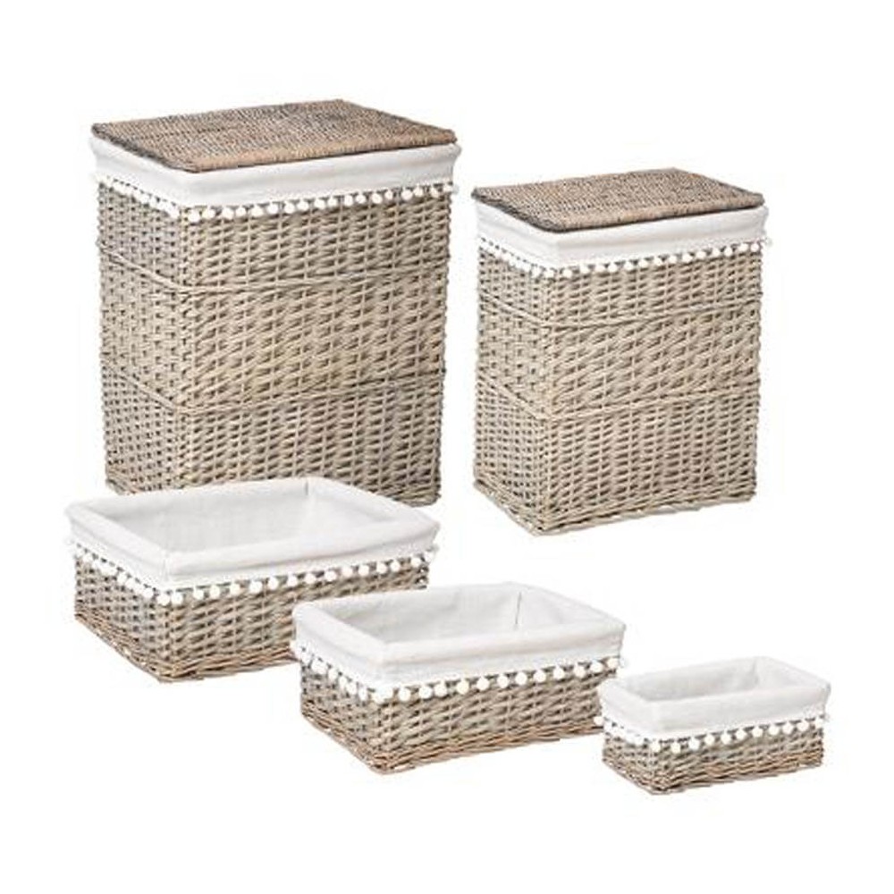 Cesto de mimbre trenzado de alta calidad con forro blanco confeccionado en tejido de algodón y poliéster rematado con borlas decorativas, muy práctico para organizar armarios y estanterías.