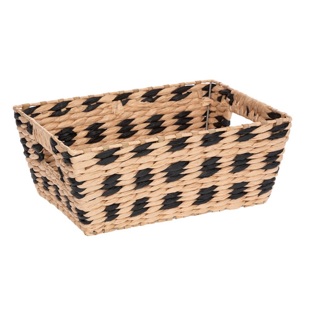El cesto multiusos esta fabricado en fibra de papel trenzada, combina el color natural y el negro creando un atractivo diseño geométrico de cuadros.