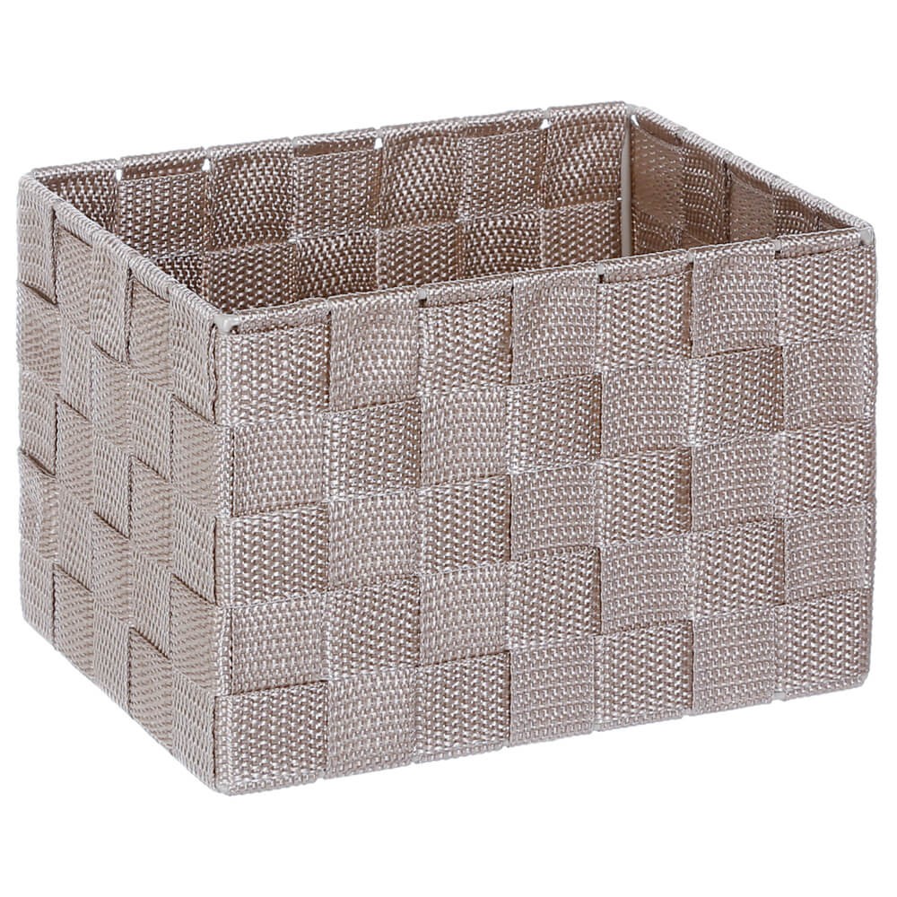 Cesta de almacenaje en formato rectangular con estructura rígida de metal y cintas trenzadas de polipropileno en color topo, ideal para organizar armarios y estanterías con estilo.