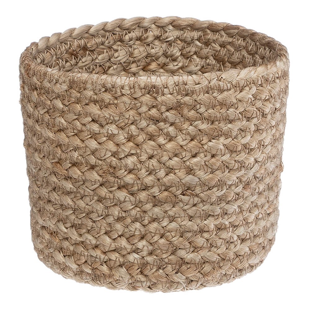 Cesta de almacenaje redonda confeccionada en fibra vegetal trenzada, perfecta para organizar artículos de baño.
