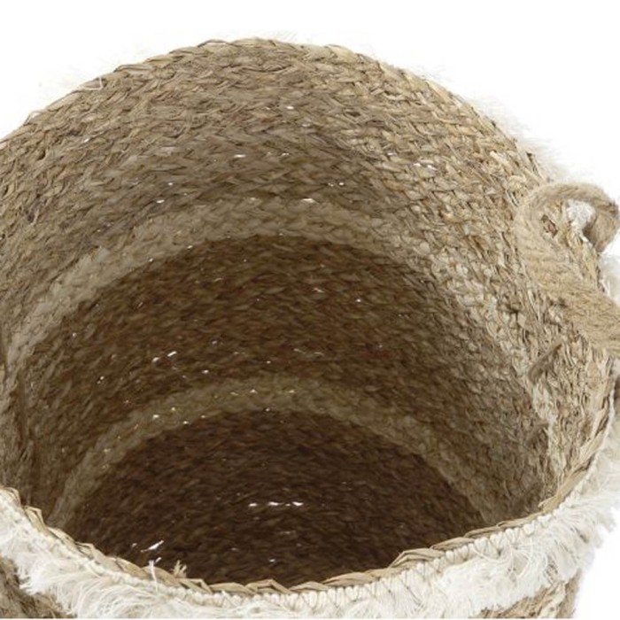 Cesta de almacenaje redonda confeccionada en fibra de maíz y seagrass trenzado con una cinta decorativa de flecos, cuenta con dos prácticas asas para agarrarla y transportarla cómodamente, perfecta como cesta decorativa y funcional para contener mantas, toallas, plantas, etc.