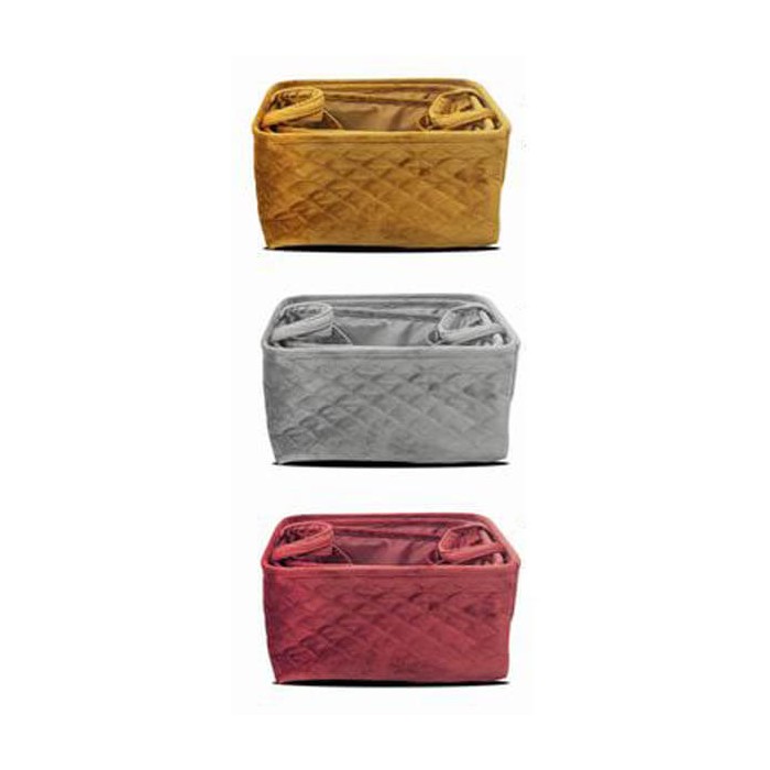 Cesto de terciopelo con asas, tres colores, mostaza, granate o gris.