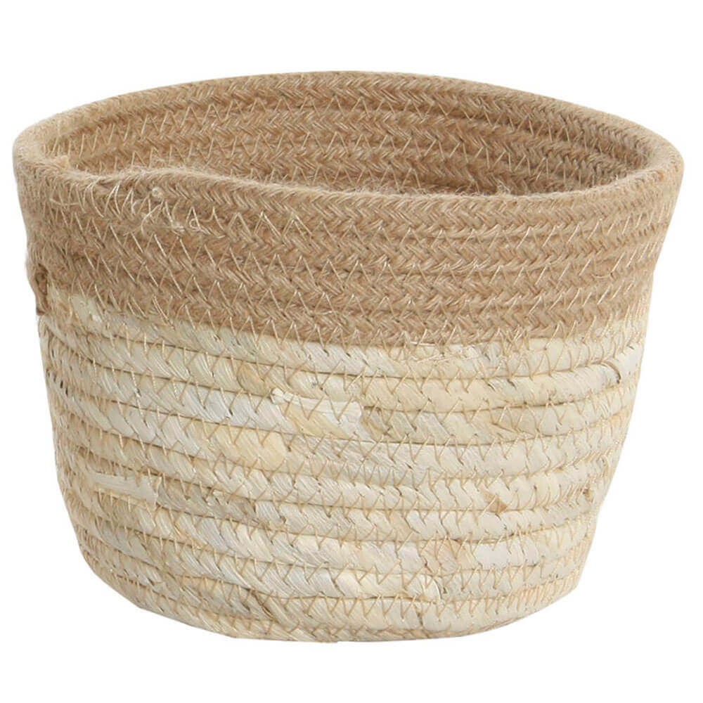 Cesta redonda bicolor fabricada en yute y fibra natural cosida con hilo, una pieza hueca ideal para organizar objetos y decorar estancias con plantas y flores secas.