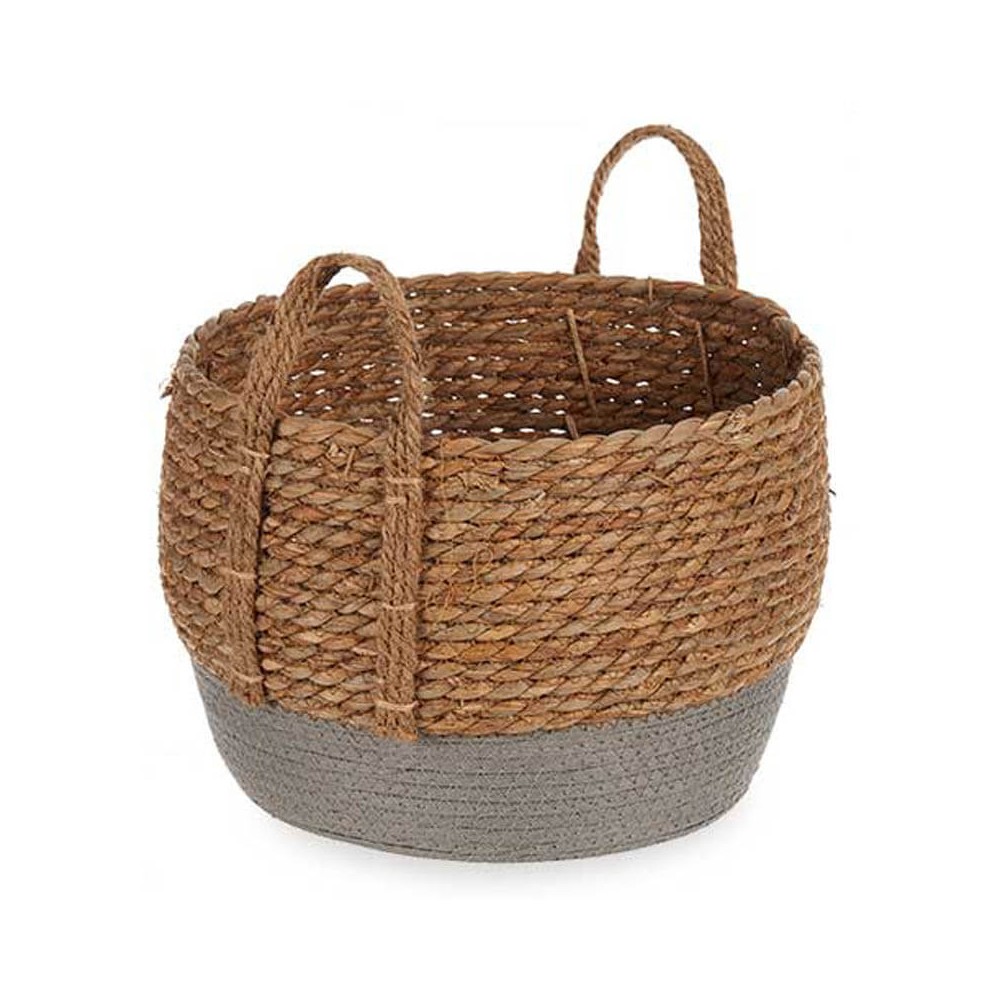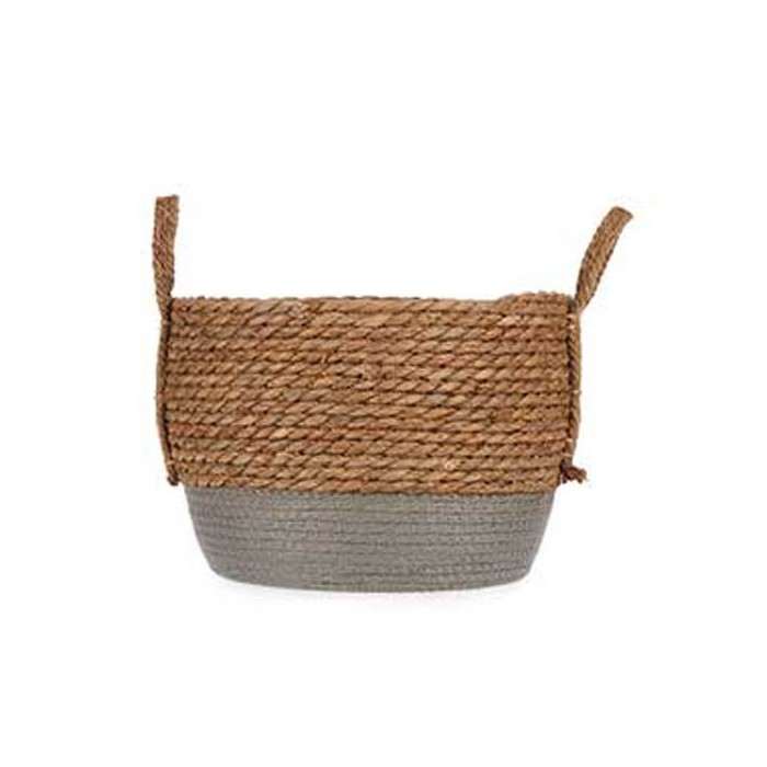 Cesto decorativo con asas de estilo Balines fabricado en fibra natural con base gris.