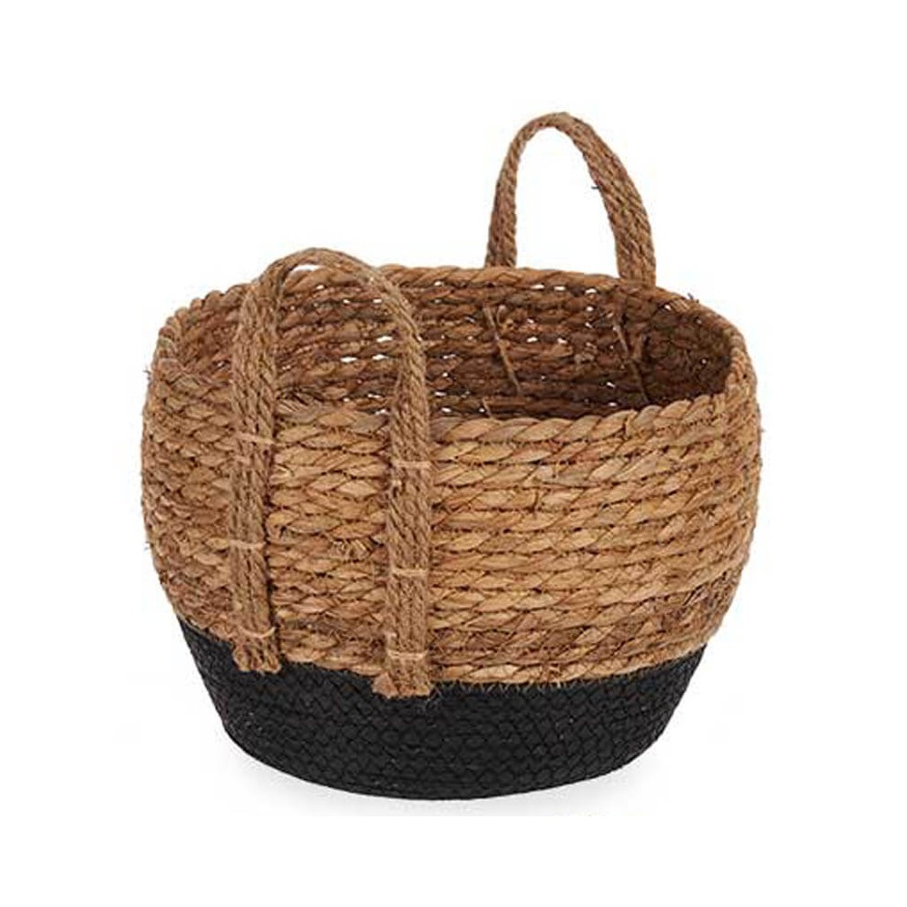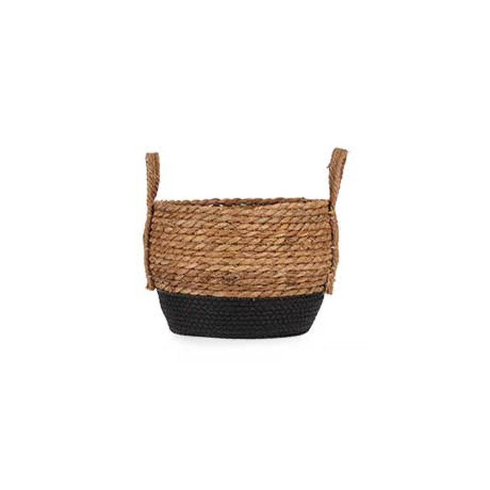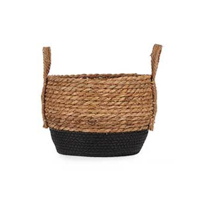 Cesto decorativo con asas de estilo Balines fabricado en fibra natural con base negra.