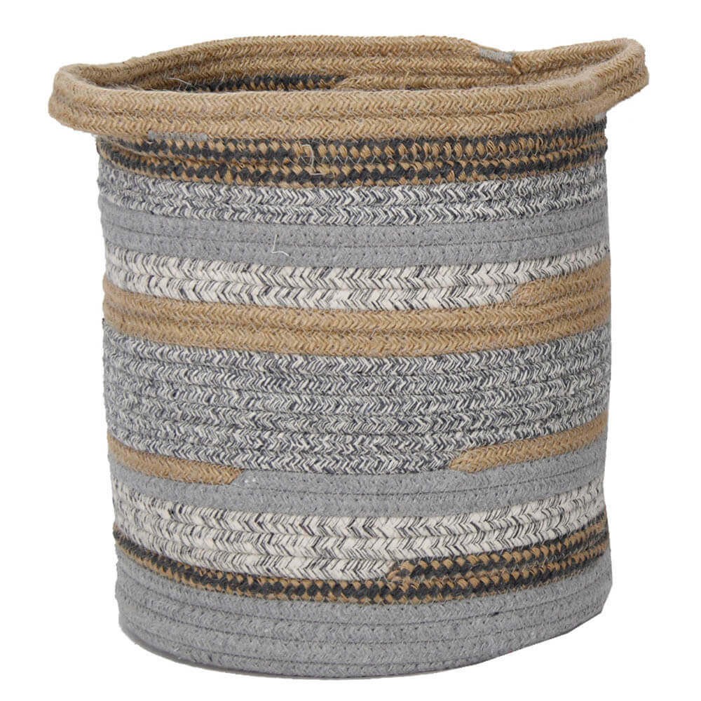 Cesta de almacenaje redonda confeccionada en algodón y yute trenzado con un original diseño listado, formada por franjas de diferentes colores y grosores en tonos grises. La cesta lleva dos prácticas asas para agarrarla cómodamente y transportar el contenido de forma fácil, perfecta como cesta decorativa y funcional para contener mantas, toallas, plantas, flores secas, etc.