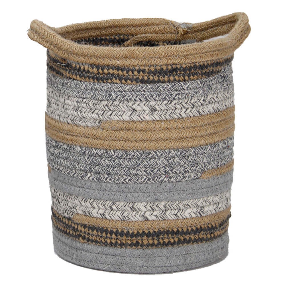 Cesta de almacenaje redonda confeccionada en algodón y yute trenzado con un original diseño listado, formada por franjas de diferentes colores y grosores en tonos grises. La cesta lleva dos prácticas asas para agarrarla cómodamente y transportar el contenido de forma fácil, perfecta como cesta decorativa y funcional para contener mantas, toallas, plantas, flores secas, etc.