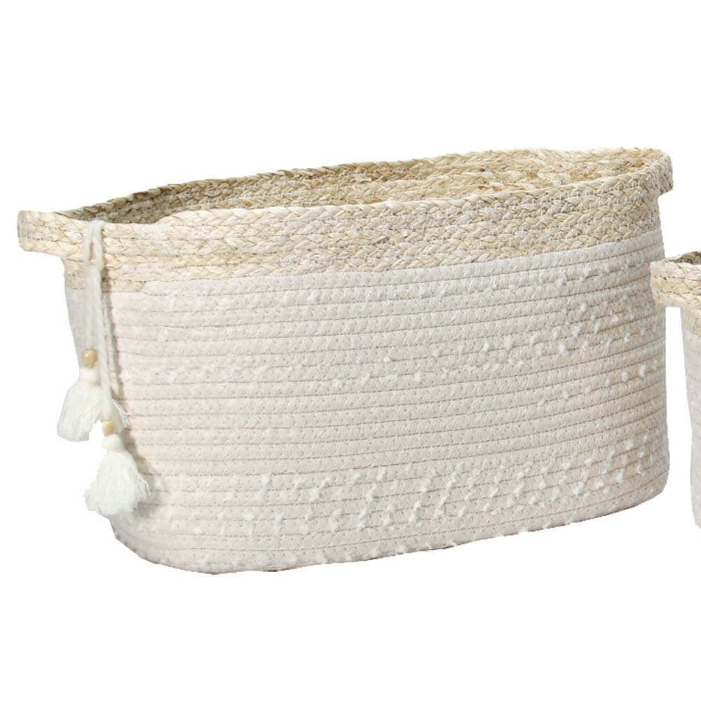 Cesto rectangular con asas de fibra de maíz y algodón en color blanco- natural.