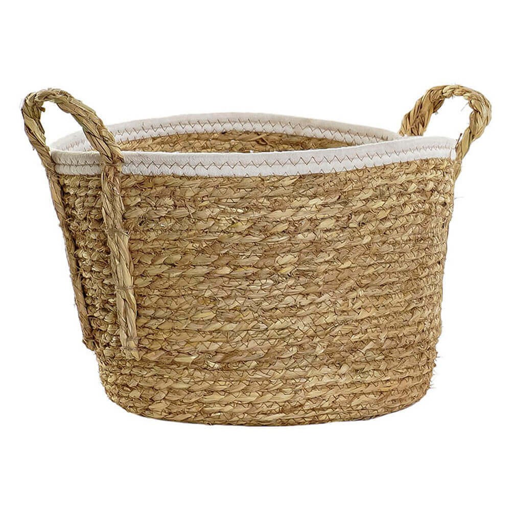 Cesta de fibra natural trenzada con ribete decorativo blanco y asas.