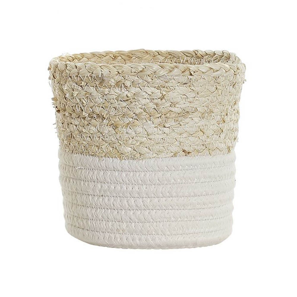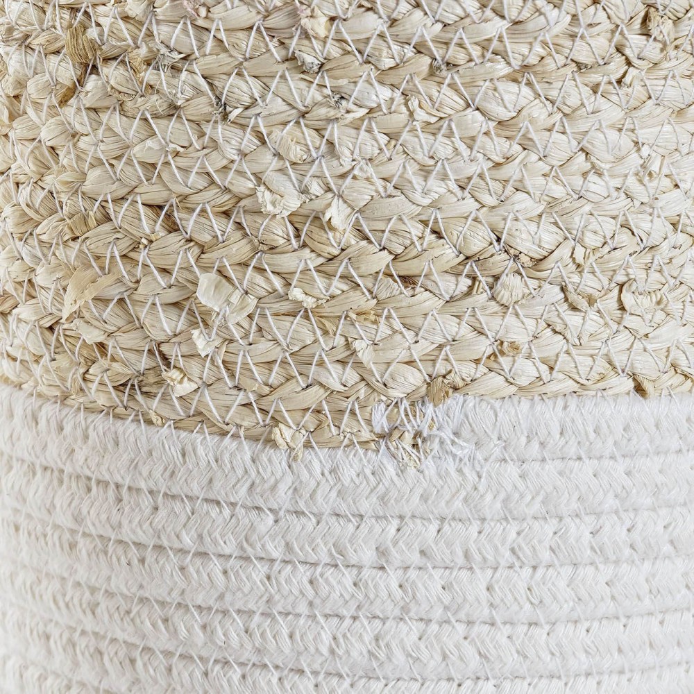 Cesto almacenaje en formato cilíndrico con un atractivo diseño bicolor fabricado en fibra natural trenzada y cuerda de algodón blanca, perfecto como complemento decorativo para organizar y contener diferentes objetos.