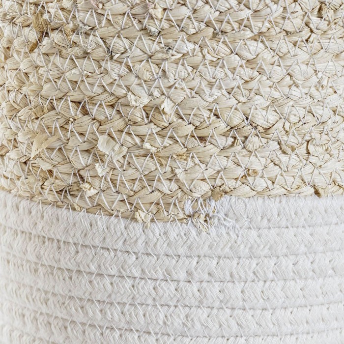 Cesto almacenaje bicolor realizado en fibra natural trenzada y cuerda de algodón blanca.
