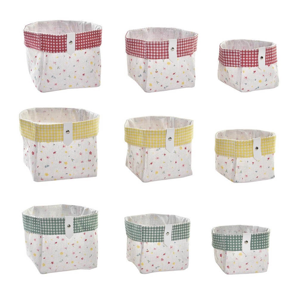 El cesto de almacenaje con un bonito diseño primaveral de flores añadirá un toque de color y luz a la estancia, lleva una cenefa decorativa con estampado vichy en color verde, amarillo o rojo y embellecedor de polipiel con remache plata.