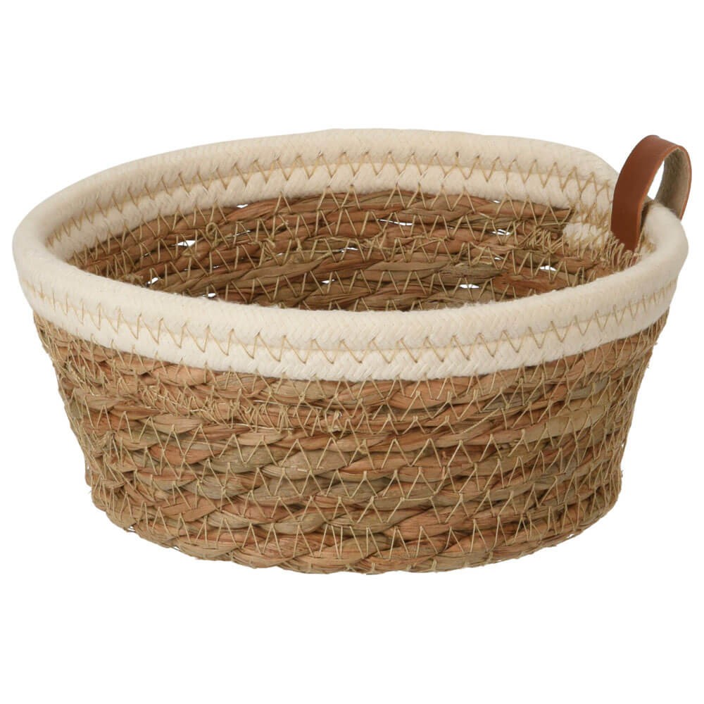 Esta cesta redonda confeccionada con materiales naturales y ribeteada con cinta blanca es perfecta como panera para que aportes un toque cálido a la decoración de tu mesa.