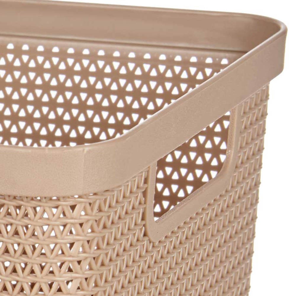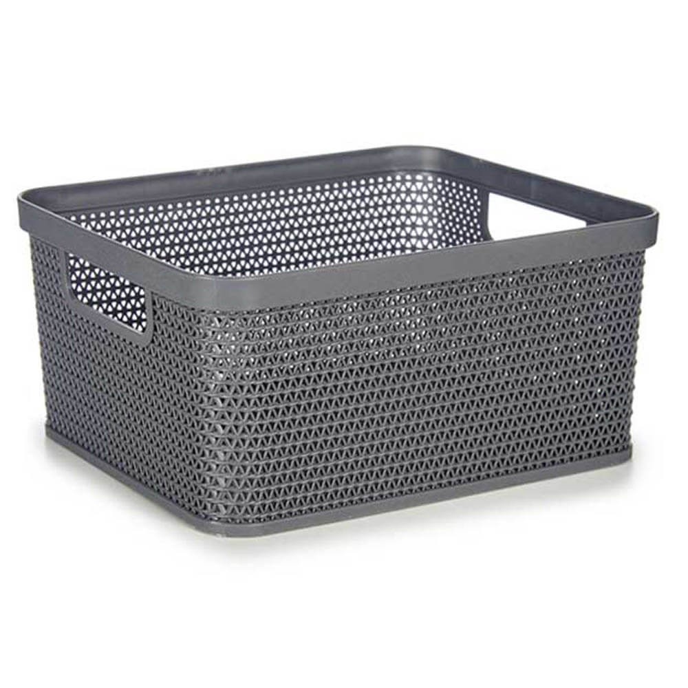 Cesto de almacenaje multiusos realizado de plástico resistente en color beige, blanco o gris. Medidas: 18,5 x 24,5 x 10,4 cm. Con asas para fácil transporte. Ideal para cocina, baño y zona de lavado. 2,5L