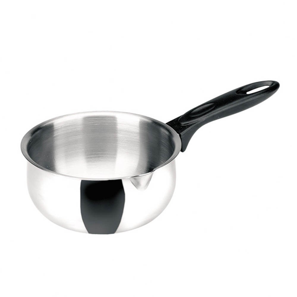 Cazo de cocina clásico con pico vertedor y mango de Baquelita, fabricado en acero inoxidable 18/10. Apto para vitrocerámica e inducción. Con 16 cm de diámetro y 1,5 litros de capacidad, es perfecto para calentar leche, chocolate o salsas.
