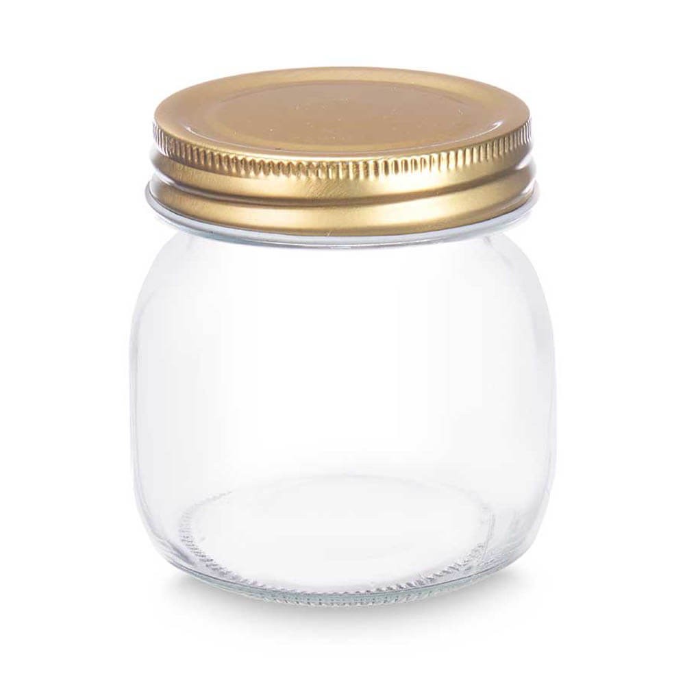 Tarro de cocina cristal transparente con 300 ml de capacidad y tapa metálica dorada con cierre de rosca. Ideal para guardar y preservar alimentos. Dimensiones: 9 x 7,5 x 7,5 cm.
