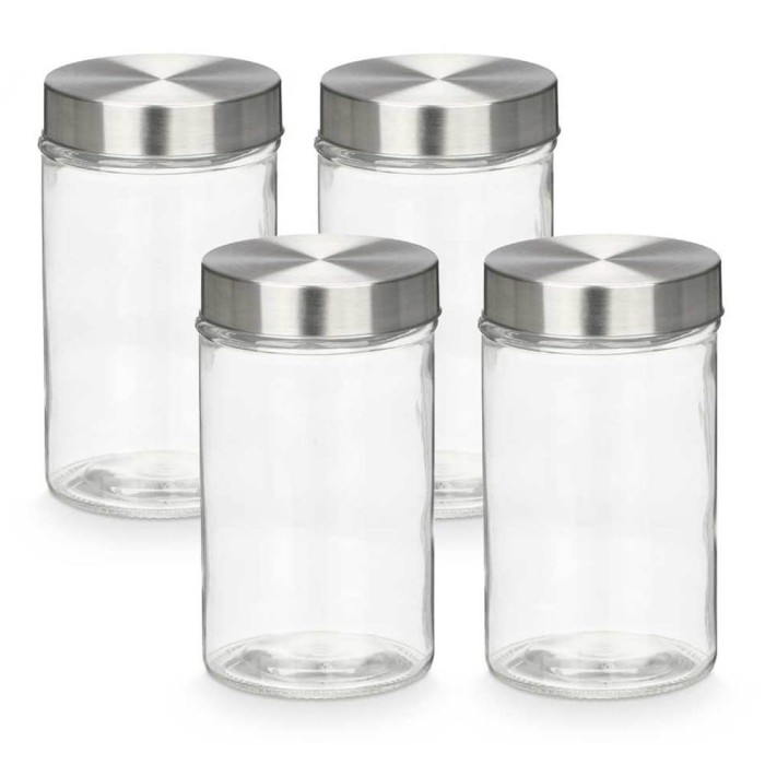 Conjunto de 4 tarros de cocina en cristal transparente con 1 litro de capacidad y tapa metálica con cierre de rosca. Ideales para guardar y conservar alimentos. Medidas: 10,5 x 41 x 18,5 cm.