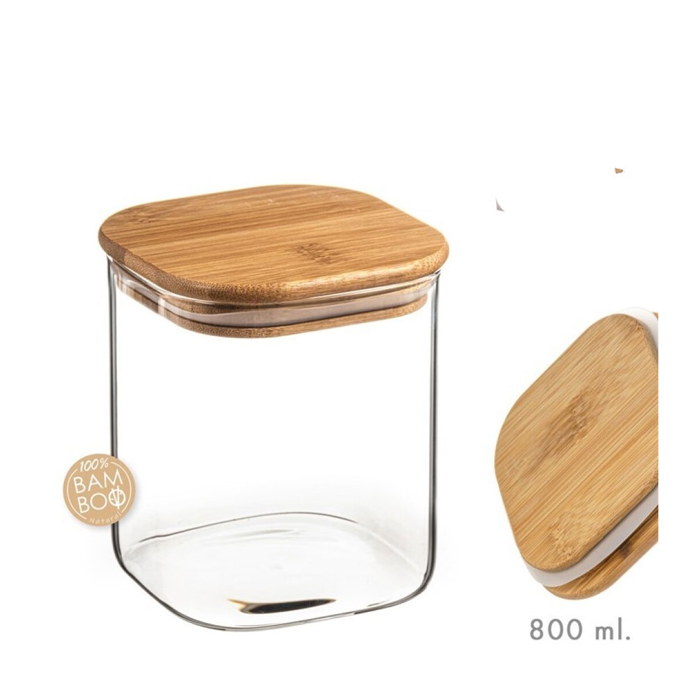 TARRO CIRSTAL CUADRADO 800ML TAPA BAMBU