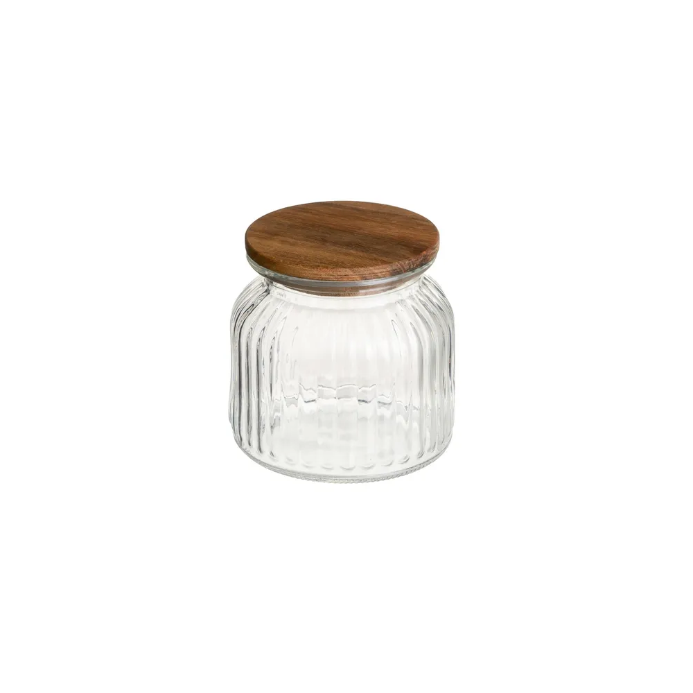 Tarro de cristal labrado con tapa de madera, ideal como elemento decorativo o como bombonera para guardar galletas, caramelos, etc.