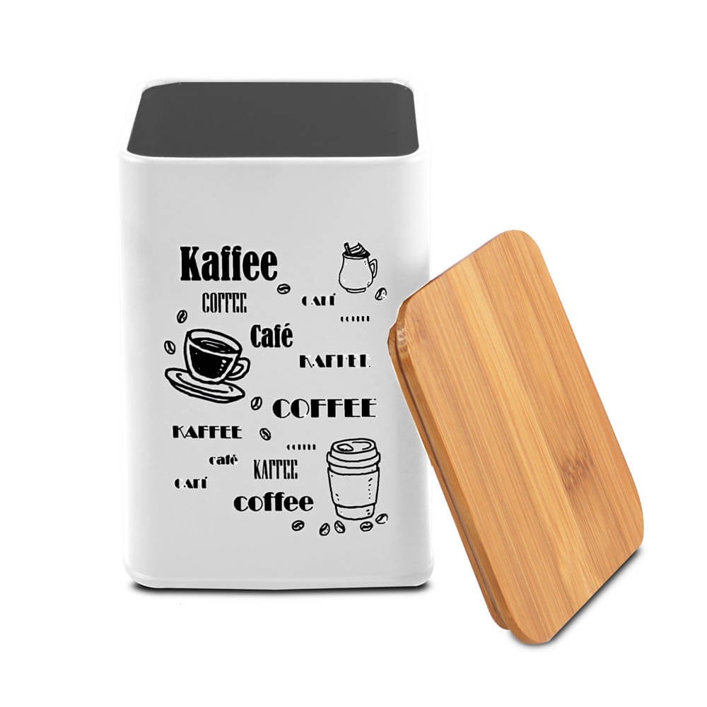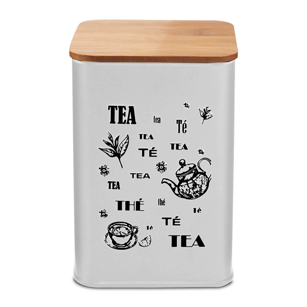 Bote de cocina metálico con tapa de bambú, formato cuadrado disponible para té, café o azúcar. Ideal para mantener los armarios de la cocina ordenados con estilo. 9.5 x 9.5 x 14.5 cm.