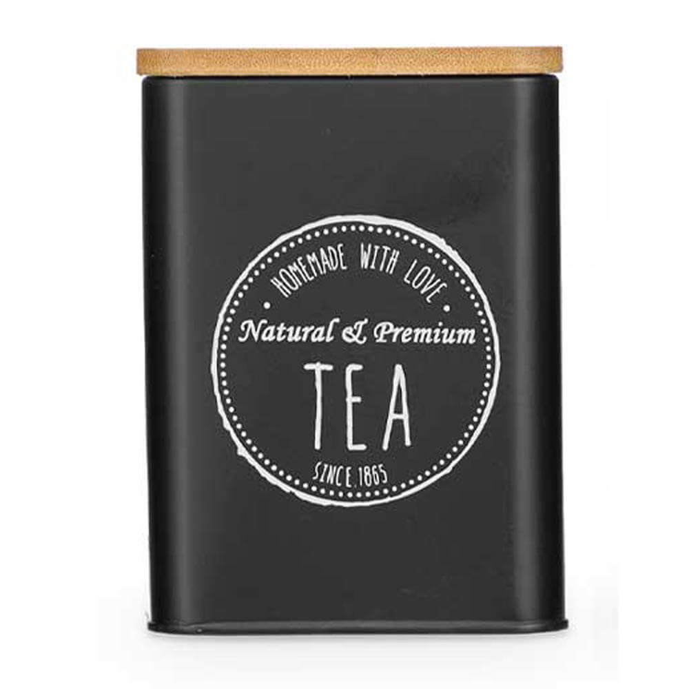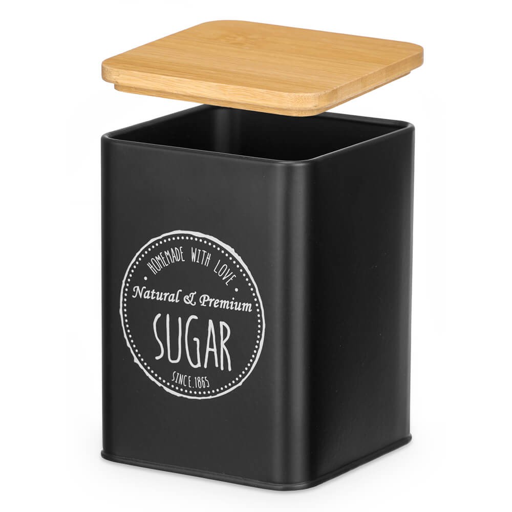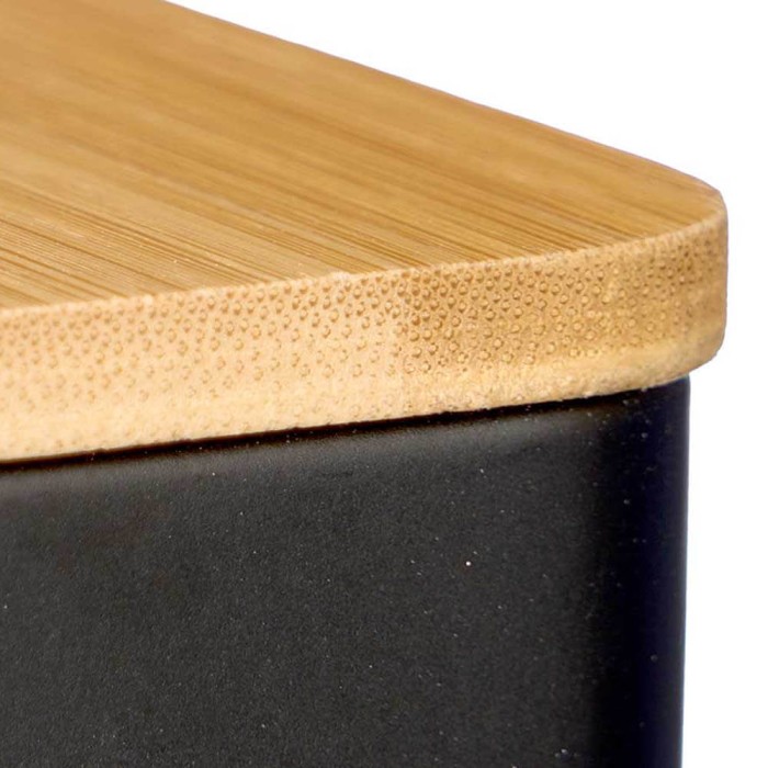 Organiza los estantes y armarios de tu cocina con estilo con este bote de cocina metálico en color negro con tapa de bambú. Ideal para té, azúcar o café. Orden y frescura garantizados.