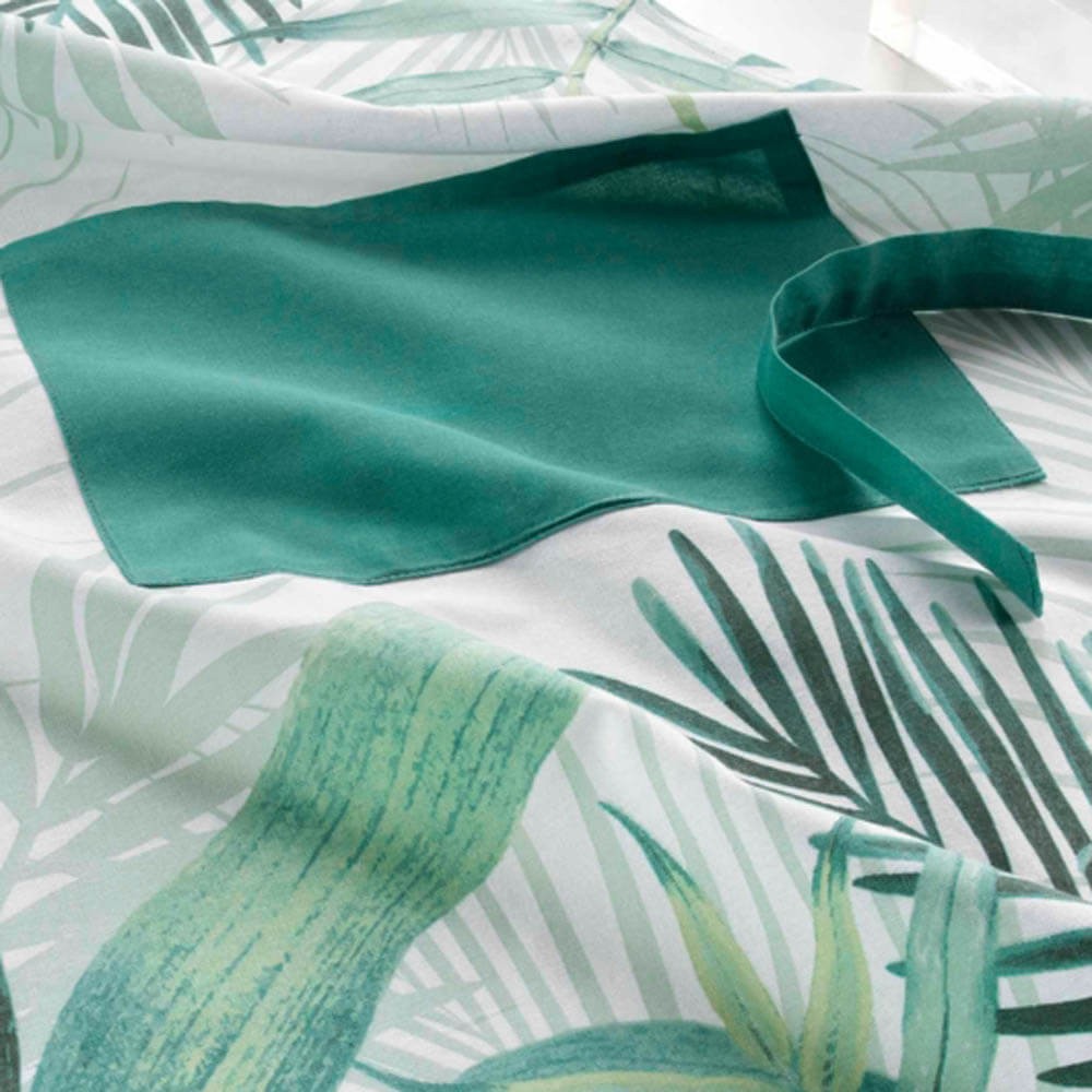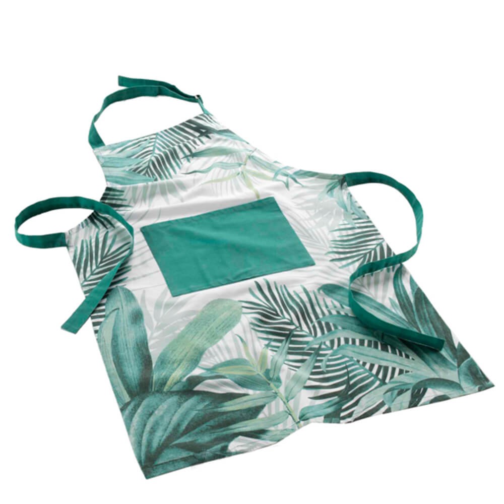 Delantal de cocina en algodón con diseño de plantas tropicales. Protección contra manchas y salpicaduras con bolsillo frontal y cintas ajustables. 60x84 cm.