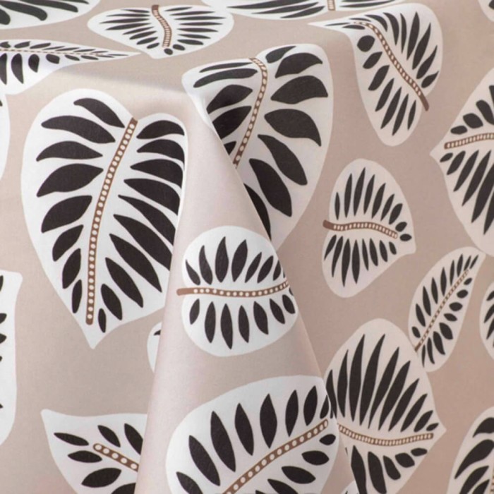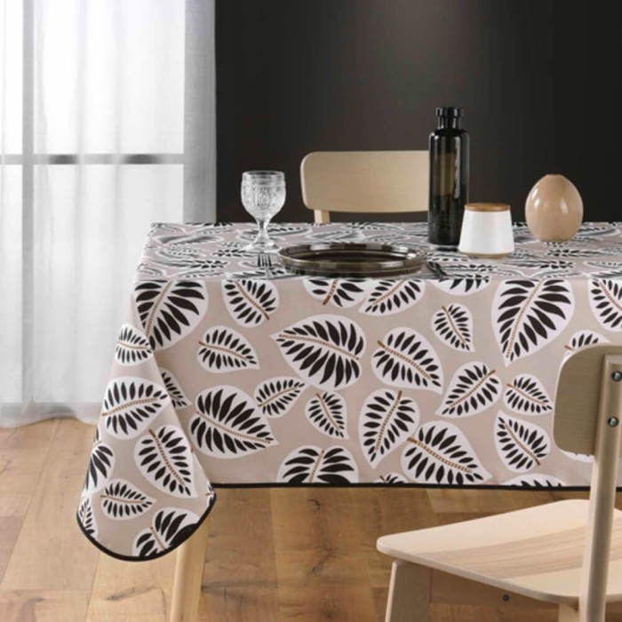 Mantel antimanchas confeccionado en poliéster estampado de tacto agradable, 150x200 cm, diseño de hojas con ribete negro. Protege y decora tu mesa con estilo y facilidad.